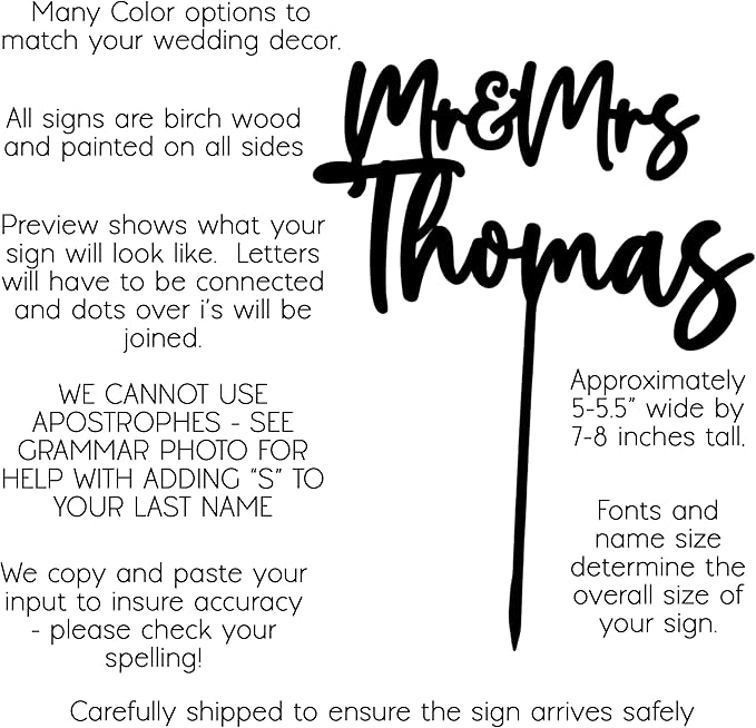 - Preview Available: When ordering our preview shows you what your sign will look like. Keep in mind, all letters will be connected. We place the pick (the part that goes into the cake) where the strongest part of the sign would be to prevent breakage. These signs can be fragile, so be extra careful when unboxing.