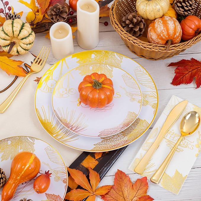 - Premium Material for Durability: Crafted from sturdy plastic, our thanksgiving plates disposable hold up to generous servings of turkey, sides, and desserts. Unlike flimsy alternatives, they resist cracking and sagging—ideal for gold thanksgiving dinnerware sets that don’t compromise on quality