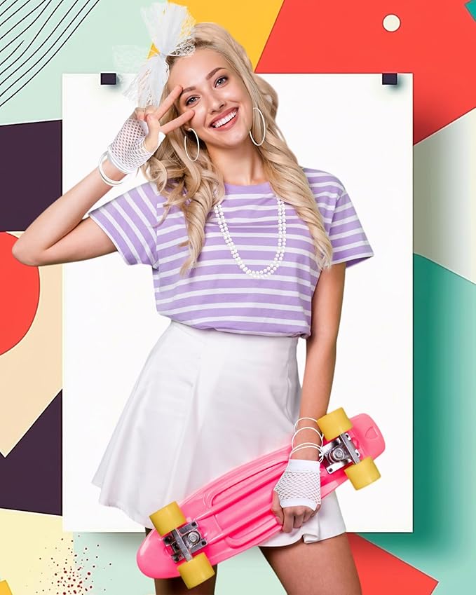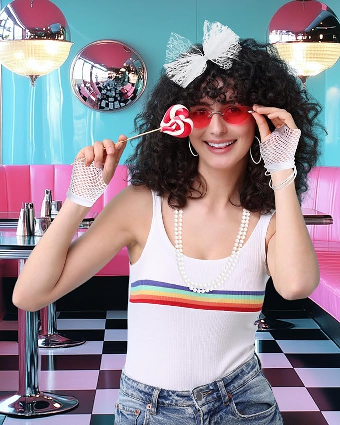 - Package includes: 80s party supply includes 1 pair fishnet gloves, 1 pair vintage earrings and 1 piece headband, 1 piece necklace and 10 pieces silicone bracelets; Meet you demands for 80's costume accessories and Halloween
