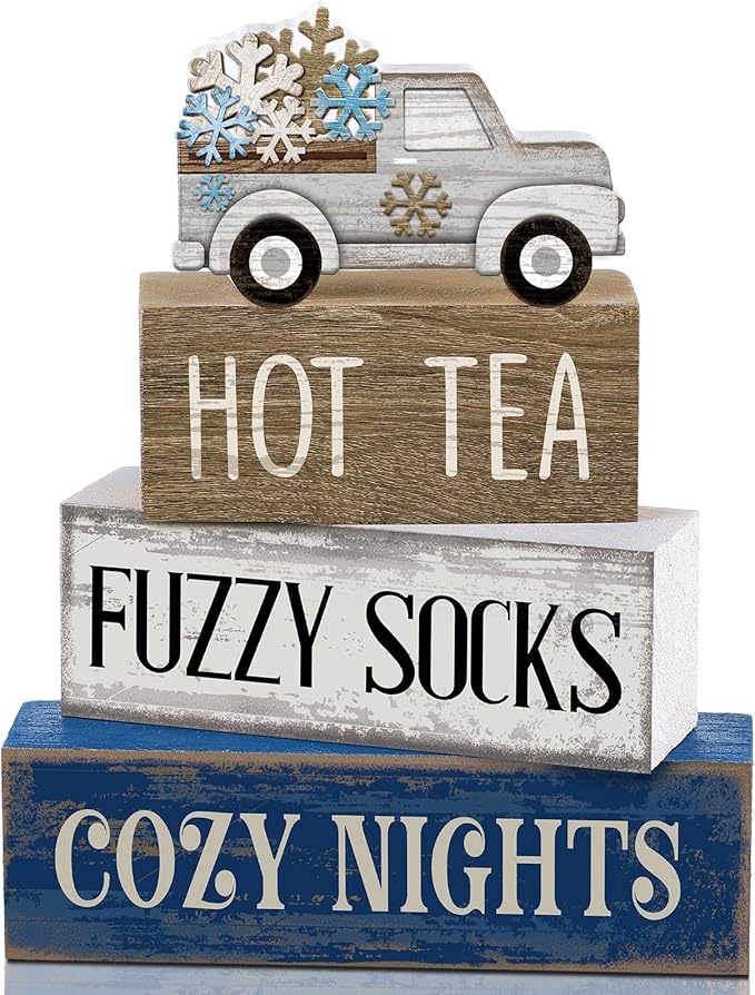- Truck Tiered Tray Decorations: winter tiered tray decor set is designed in the shape of a classic truck with snowflake sign and books, come with 4 wooden signs, 1 truck sign and 3 wood decoration books; Vibrant Christmas centerpieces are suitable for winter parties and home to welcome the holiday