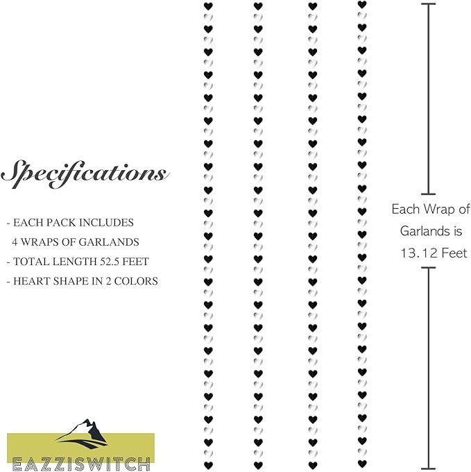 Men Black Birthday Party Decorations: Silver White Glitter Hearts Banner Garland Streamers Backdrop for Bachelorette Bachelor Events Engagement Wedding Celebration Halloween Décor - 52 Ft