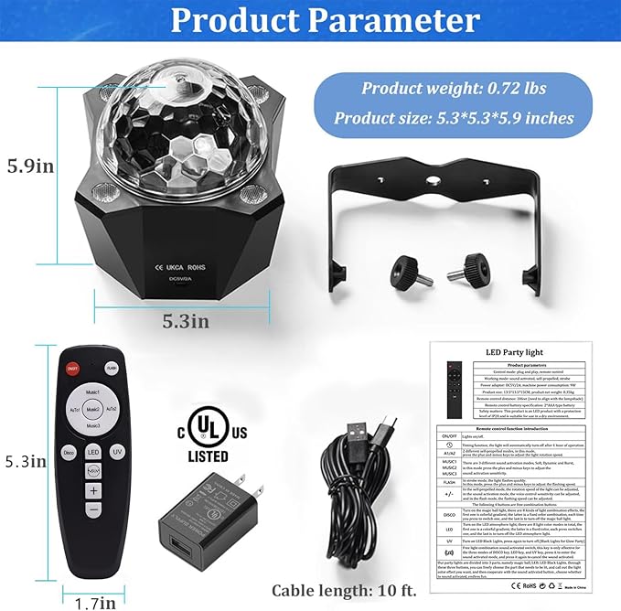 - Lighting effects: Our party lights are a collection of three lighting sets, including a 6-color disco ball light, colorful ambient light, and black suitable for a glow party. With the remote control, you can turn on the parts you want and adjust your favorite lighting combinations. Endless fun with the sound activation button.