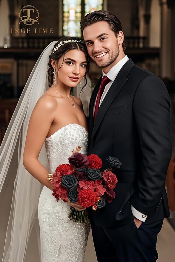 TINGE TIME Rose Artificial Flowers Combo, Gradient Color Faux Foam Roses with Stems for DIY Wedding Bridal Shower Party Table Centerpieces Fake Floral Arrangement Home Decor (Gothic Black & Red)