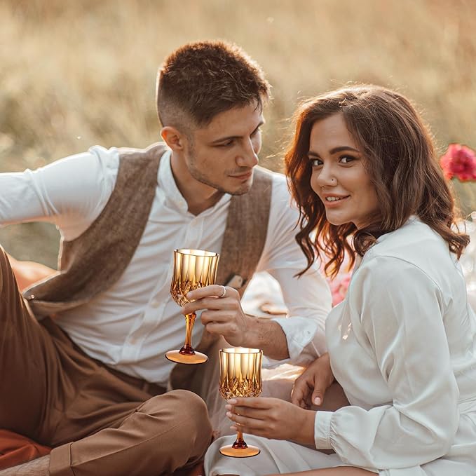 XUWAIDSGN 7oz Plastic Vintage Wine Glasses Drinking Glasses Unbreakable Wedding Glassware Crystal Water Goblets Reusable Drinkware Vintage Champagne Flutes (48, Brown)