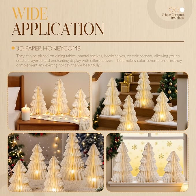 - Aesthetic Design: These lighted paper Christmas tree decorations feature a unique 3D honeycomb christmas tree structure that unfolds to create a layered Christmas tree shape. Built-in 5 warm LED strings create a soft and romantic light effect through the honeycomb paper holes. Lights can be used individually without complicated wiring, easy to light up the Christmas corner