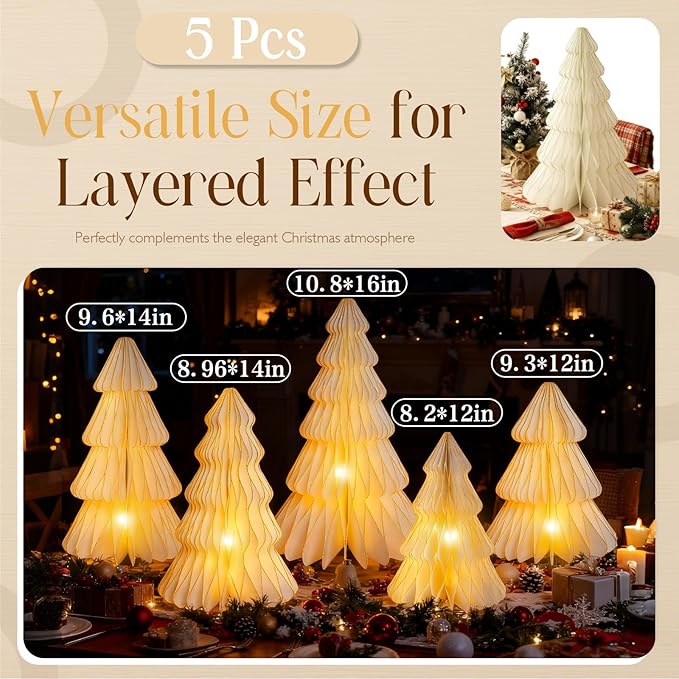 - Aesthetic design: These lighted paper Christmas tree decorations feature a unique 3D honeycomb christmas tree structure that unfolds to create a layered Christmas tree shape. Built-in 5 warm LED strings create a soft and romantic light effect through the honeycomb paper holes. Lights can be used individually without complicated wiring, easy to light up the Christmas corner