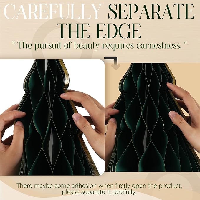 - Easy to Use: This Christmas table decoration is super easy to use. Firstly, set the LED light at the center of the Christmas tree decor, then, just pull the two ends of the Christmas tree apart and connect the bult-in magnetic closure together, a perfect honeycomb Christmas tree will appear on the table, foldable design is more convenient to store