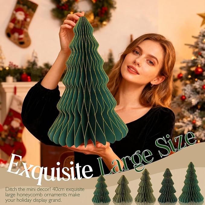 - Christmas Decorations: You will get 5 large Christmas centerpieces for tables measuring 12/14/16 inch: 2 green paper christmas trees and 3 forest green paper christmas trees, coming with 5 led lights. The vintage colors in different sizes and can perfectly fit your elegant interiors, and bring a unique feature to Christmas table decorations for home