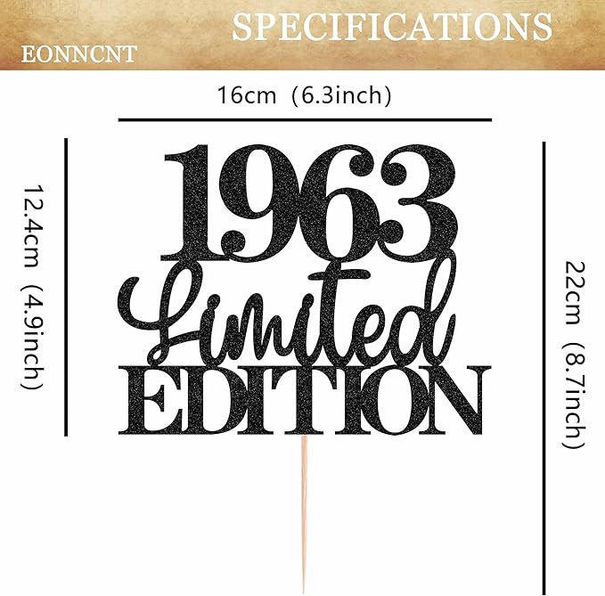 - Shining Party Scene: The unique cursive design of this Limited EDITION 1963 cake smash decor is unique and sparkling, perfectly presenting the beauty of the birthday party venue. This 62nd happy birthday cake decoration can be insert on pie, ice cream, and cupcakes, making it the perfect photo background, perfect for 62nd anniversary or 62nd birthday party