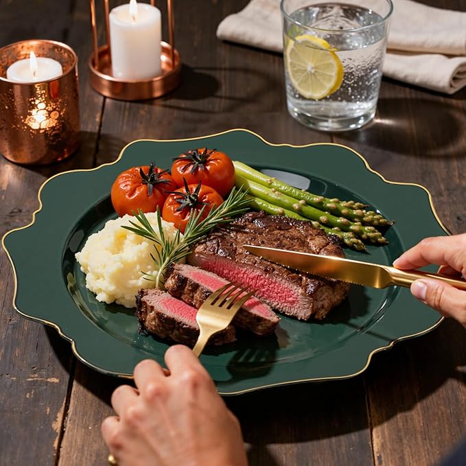 - Perfect for all occasions: Family dinners, holiday birthdays, brunch with friends, wedding, birthday party, Christmas — these fancy disposable dinnerware add a festive pop to every occasion. They’ll make your green and gold table look totally polished, no extra effort needed!