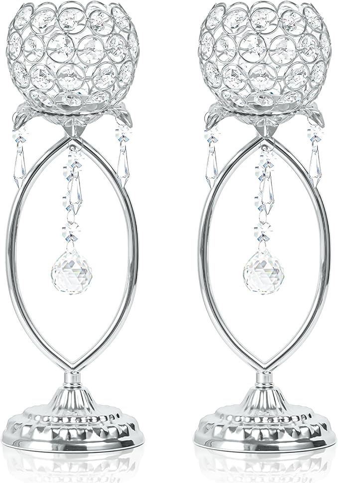 2 Pcs Silver Elegant Metal Crystal Tea Light Candle Holders with Crystal Pendants, Hollow Design - Wedding Table Centerpieces for Anniversary Birthday Party, Home Decor