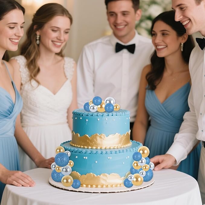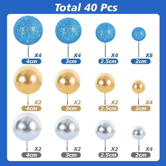 - 【Package include】40 pieces plastic foam balls cake toppers in 3 colors:blue, gold, silver. Size:including 0.79 inch x16, 0.98 inch x8, 1.18 inch x8, 1.57 inch x8.
