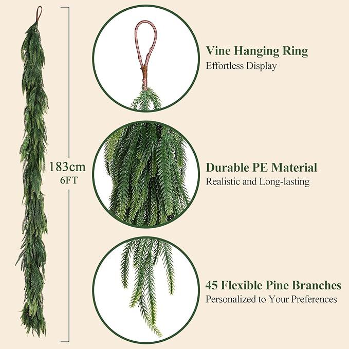 - Easy to Use & Flexible Shaping - No setup needed! These pine garlands come ready to use right out of the box. Compressed during shipping? Gently fluff these needles to restore fullness in seconds. And the soft PE material makes the real touch Norfolk pine garland highly flexible, allowing you to easily shape it to drape over mantels, hang on walls, or decorate stairs. Professional results, zero effort!