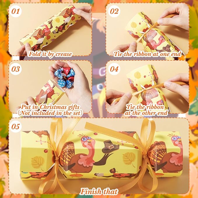 - Package Content: you will receive 50 pieces of unfolded Thanksgiving crackers and matching ribbons with 2 different color patterns, 25 pieces for each pattern; The single size of these Thanksgiving crackers is about 7.3 x 1.9 x 1.9 inch/ 18.5 x 5 x 5 cm; Please note that our products are not folded, so you need to complete the folding after receiving the goods
