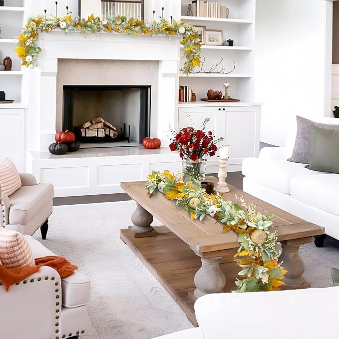 - Fireplace Mantel Decor: Breathe autumn into your home: whether framing your fireplace as elegant mantel decor, winding down your dining table, or accenting cabinetry and entryways - this fall garland is fall's versatile muse