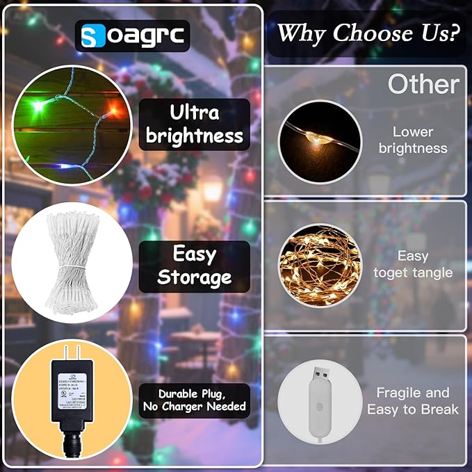 - Safe for Festive Joy - Cool to touch LEDs ensure safety for kids and guests at parties and holiday setups a win for families. Enjoy multicolor fun worry free, all season long. At Soagrc, your satisfaction is our priority. Our dedicated customer service team is available 24/7 to answer any questions and assist with setup or troubleshooting. Contact us anytime for support that’s as reliable as our twinkling lights for Christmas tree.
