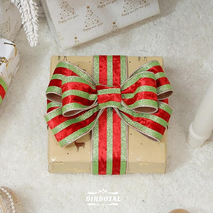 Red Velvet Wired Ribbon with Lime Green Glitter Stripe 2.5 Inch Crushed Velvet Christmas Ribbon, 10 Yards for Gift Wrapping, Crafts, Christmas Tree Decorations, Wreaths, Garlands