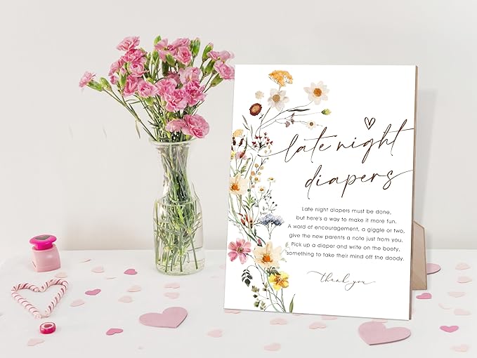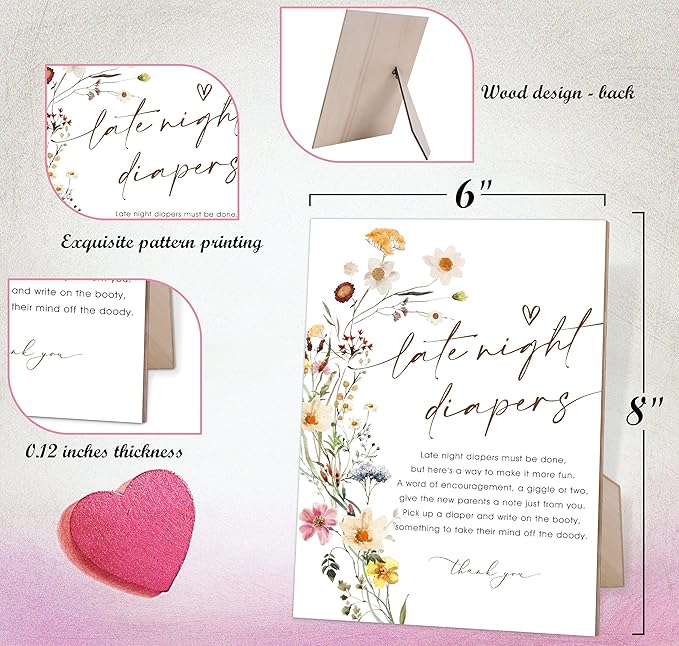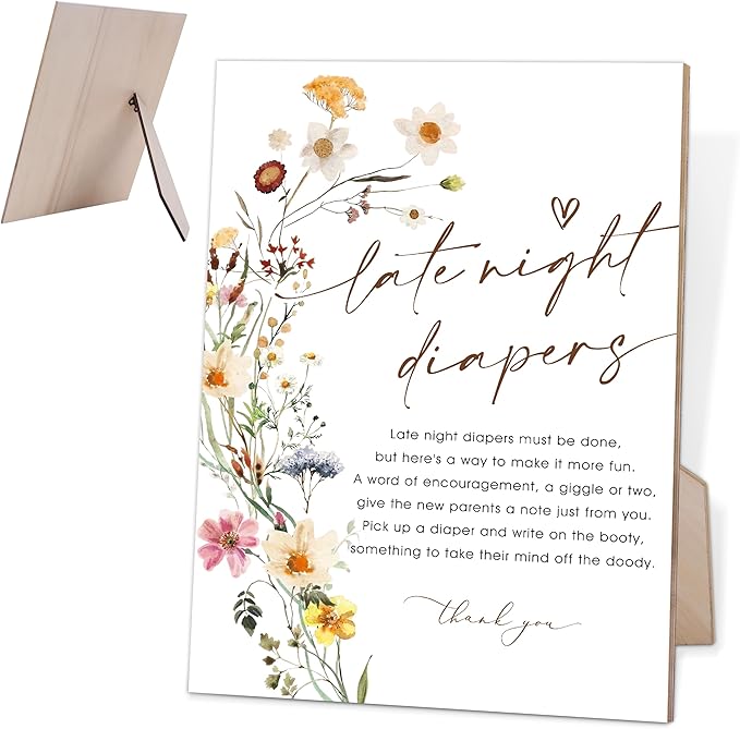 Flower Baby Shower Games Late Night Diapers Sign, Baby Shower Table Decorations for Gender Reveal Party, Centerpiece Party Decorations, Gender Reveal Gifts, 6X8 Inch Wooden Sign with Stand, 8