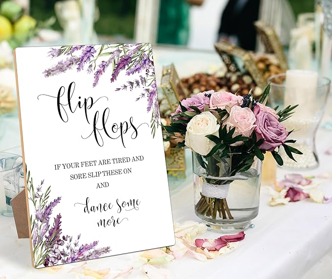 Wedding Flip Flops Sign, Lavender Bridal Shower Decorations, Engagement Party Decor, Centerpieces for Tables, Purple Floral Wooden Sign with Stand for Wedding Reception And Bridal Party Decor, 32