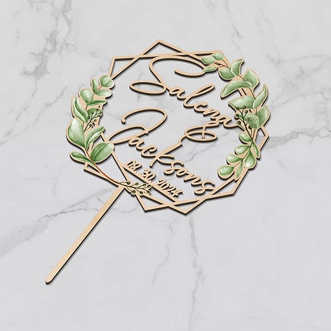 Wooden Wedding Cake Topper Personalized Names Date Geometric Eucalyptus Leaves Cake Decoration for Engagement Anniversary