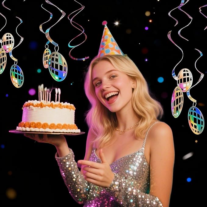 - HANGING SWIRLS PACKAGE CONTENTS: 48-piece holographic disco ball decorations featuring iridescent spheres and spiral streamers in pink, blue, and purple colors for stunning party ambiance (18 printed cards+18 single helices+12 double helices)