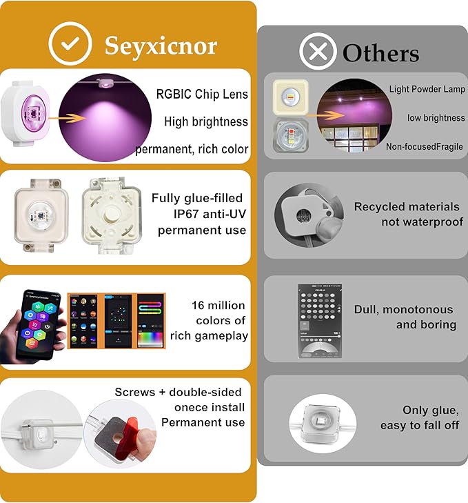 - Dynamic Lighting & Individual DIY-Transform your home into a year-round showpiece! With 16M colors and RGB+IC tech, Seyxicnor permanent outdoor lights deliver dazzling, customizable effects—no cheap dot-powder look. Choose from 108 scene modes for Christmas, Halloween, or parties. Ideal outdoor permanent lights for house, roof, patio, eave, porch and any other home decorations, they let you customize each bulb’s color, brightness, and effects via app for endless festive magic.