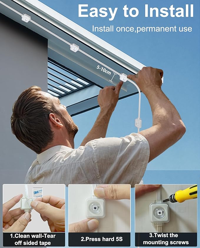 - Easy to Install: No Wiring Hassle-Mount in seconds with 3M adhesive strips or secure permanently with included screws and clips. Just clean the surface, peel, and stick—no wiring needed! As permanent Christmas lights outdoor, they’re pre-wired for convenience (do not cut) and perfect for under eaves lighting or house lights outdoor all year applications.
