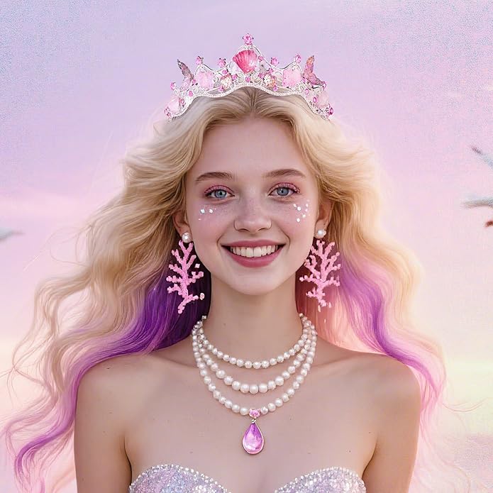 - Ocean-Inspired Design:Features a glittering mermaid crown with seashells and mermaid tail accents, creating a dreamy ocean princess look perfect for sea-themed parties and fantasy dress-up occasions