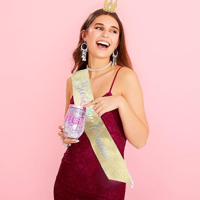 Birthday Princess Sash for Women Tiara & Crowns Headbands for Girls Happy Birthday Party Accessories Favor Supllies Leona Pink Gold, 2 Pack