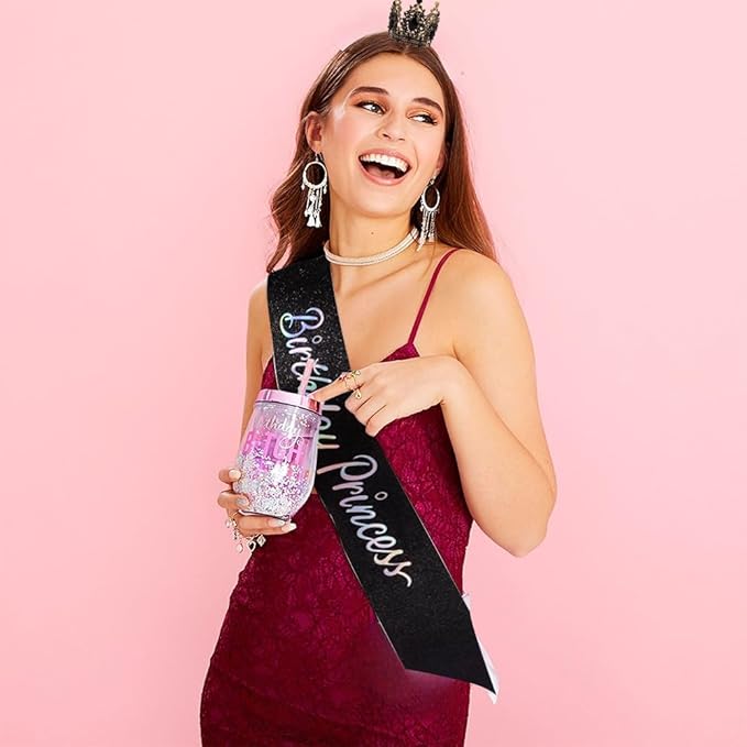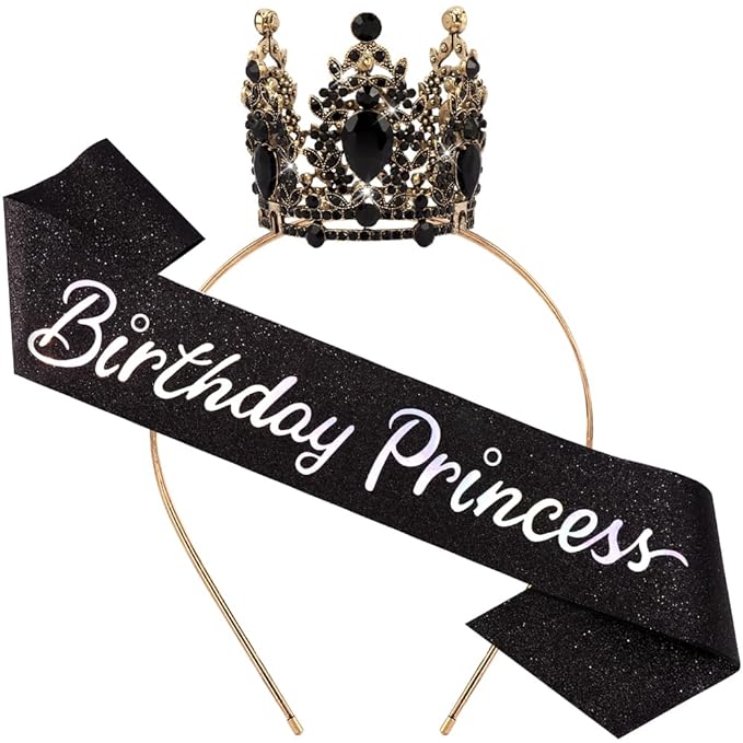 Birthday Princess Sash for Women Tiara & Crowns Headbands for Girls Happy Birthday Party Accessories Favor Supllies Leona Gold Black Pink, 2 Pack