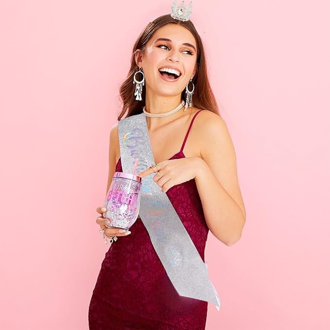 Birthday Queen Sash for Women Tiara & Crowns Headbands for Girls Happy Birthday Party Accessories Favor Supllies Leona Silver Pink, 2 Pack