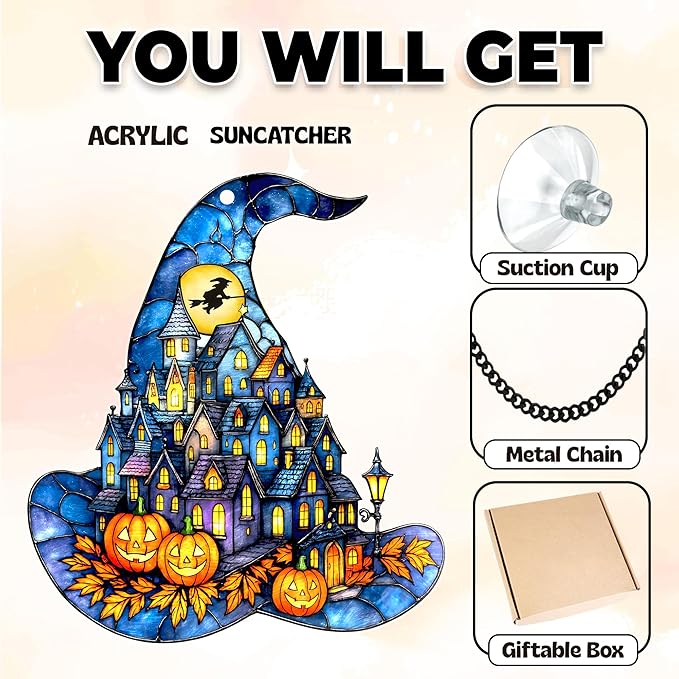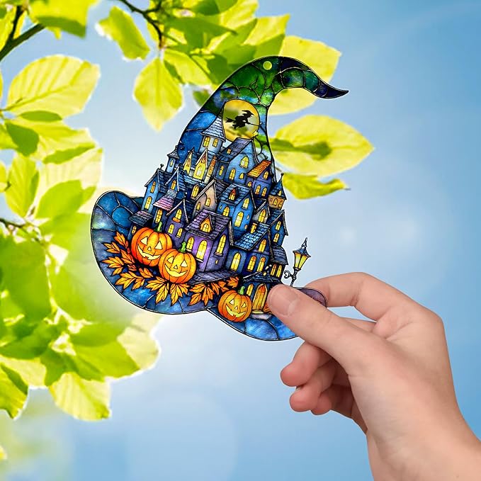 - Witch Hat Suncatcher: Add spooky charm to your home with this gothic Halloween window hanging, featuring a haunted town inside a witch’s hat, glowing pumpkins, autumn leaves, and a flying witch silhouette against the moon — perfect for creating cozy fall vibes.