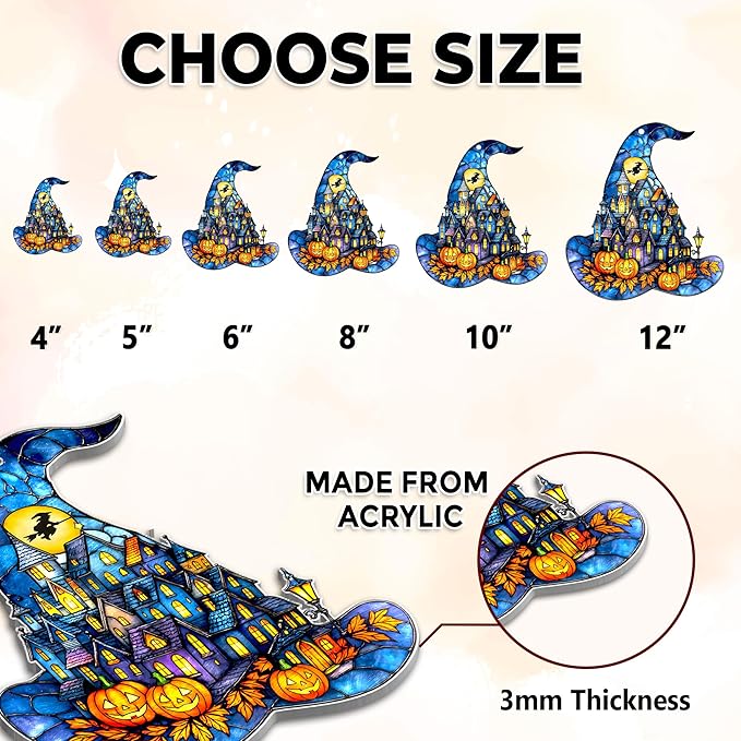 Witch Hat Suncatcher for Window Hanging, Gothic Halloween Decoration, Spooky Town Pumpkin Acrylic Ornament, Jack-o’-Lantern Fantasy Decor, Autumn Halloween Christmas Witchy Gifts for Women, Friends