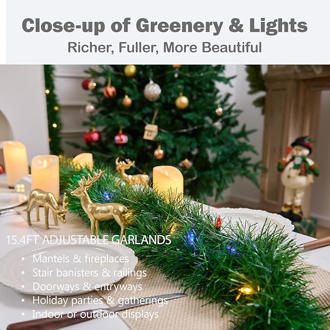 - Full & Beautiful Christmas Decorations– This 15.4ft Christmas garland with lights features 50 warm white LEDs and a lush 3.5-inch width. Made with thicker, high-quality greenery, it looks fuller and more vibrant than standard garlands, bringing a rich festive feel to any space.