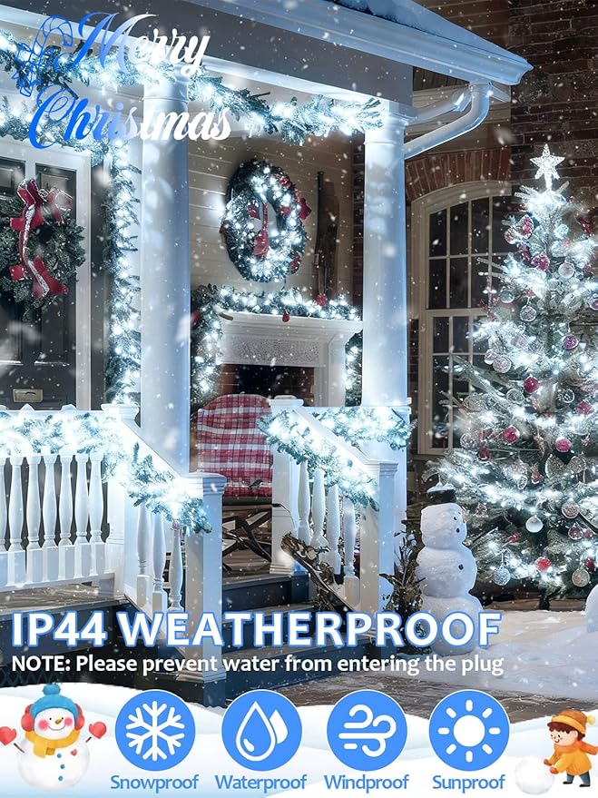 - Waterproof Christmas String Lights Outdoor: Our durable cool white twinkle lights are IP44 waterproof and designed for unpredictable weather conditions, protecting against strong winds, rain, snow, and high temperatures, providing stable light. The green wire blends seamlessly into your Christmas tree and outdoor landscape, enhance your overall decor. The 29V low-voltage plug ensures safety and durability. Note: Keep the plug dry. Light is shining, laughter is echoing, Christmas is coming!