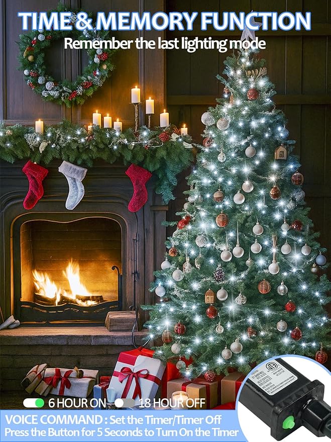 - Voice Controlled Christmas Lights: Our 300 LED cool white Christmas decorative light features a voice controlled plug. The Christmas green wire string lights has 12 modes, adjustable brightness, timer and memory functions. Simply use a few short, clear commands to control the lights, freeing your hands and increasing efficiency. Perfect for indoor and outdoor use, whether you're hosting a holiday party or enjoying a cozy evening, our voice controlled lights bring wonderful style and smart function.