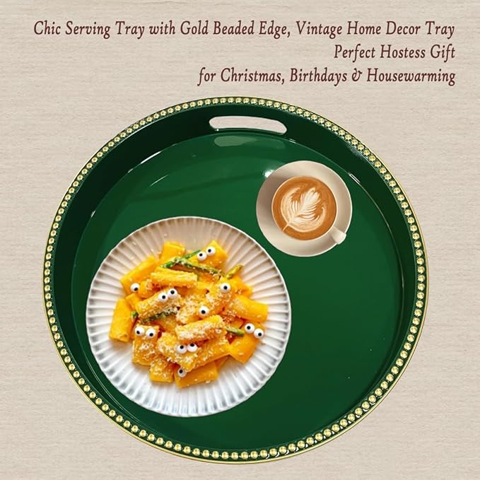 Green Decorative Tray for Coffee Table, Round Beaded Plastic Serving Tray forKitchen Counter, Ottoman, Living Room,(13")