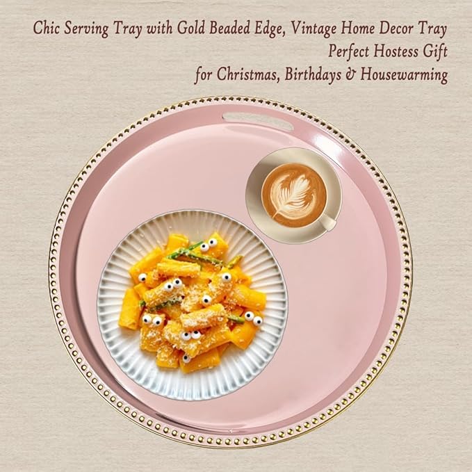 Pink Decorative Tray for Coffee Table, Round Beaded Plastic Serving Tray forKitchen Counter, Ottoman, Living Room,(13")