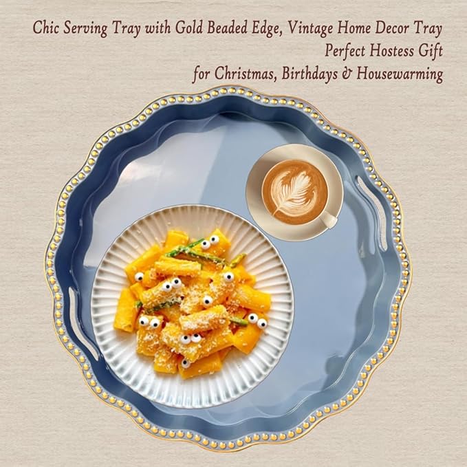 Blue Decorative Tray for Coffee Table, Wavy Scallop Beaded Plastic Serving Tray forKitchen Counter, Ottoman, Living Room, (13")
