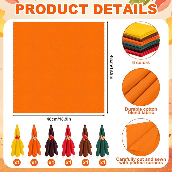 - Practical Size Design: the Thanksgiving napkin ring holder measure approximately 1.57 inches/ 4 cm in diameter, and the napkins are 18.9 x 18.9 inches/ 48 x 48 cm in size; This ideal dimensions make them perfect for table settings and party use, combining aesthetics with functionality