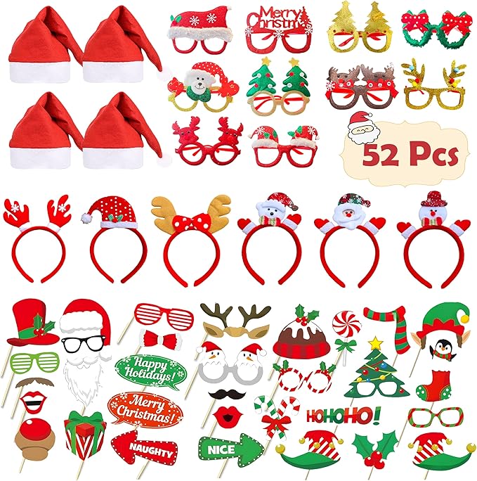 - 🎄 ALL-IN-ONE FESTIVE FUN: 52 Pcs Christmas Photo Booth Kit! Get ready for an unforgettable holiday season with our surprising photo booth prop set! This value-packed selfie photo props kit includes 10 unique Christmas glasses frames, 6 adorable headbands, 4 classic Santa hats, and 32 DIY handheld pose sign props - everything you need for joyful family photos, holiday parties, or social media moments, ensuring endless laughter and perfect pictures for everyone