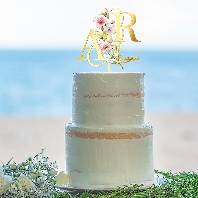 Personalized Spring Wedding Cake Topper in Acrylic Custom Bride and Groom Initial Cake Topper Wedding Date Cake Decoration (Spring Flowers)