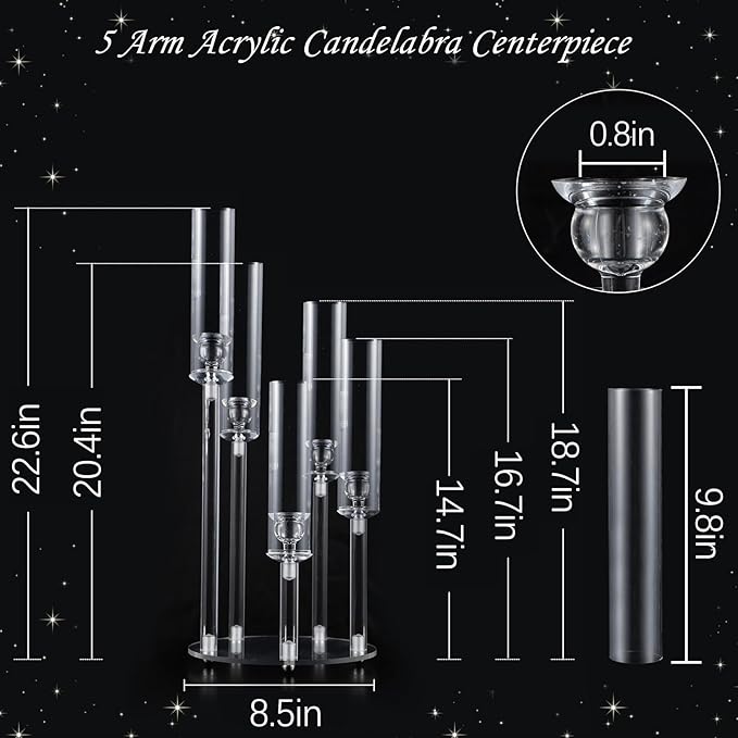 - 【5 Arm Acrylic Clear Candelabra Centerpiece】you will receive 12 sets of acrylic candlestick holders with shades, the height of the candlestick: 3.7", 5.7", 7.6", 9.6", 11.5",suitable for electric candles with a diameter of 0.8 inches the diameter of the round base: 8.6", cylinder shades high is 9.8" ; Note: please use electronic candles and the set does not include candles