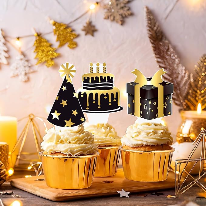 - 2026 new years eve party cupcake toppers: Set of 48 premium cupcake toppers featuring 24 unique New Year's designs in elegant black and gold color scheme for 2026 celebrations