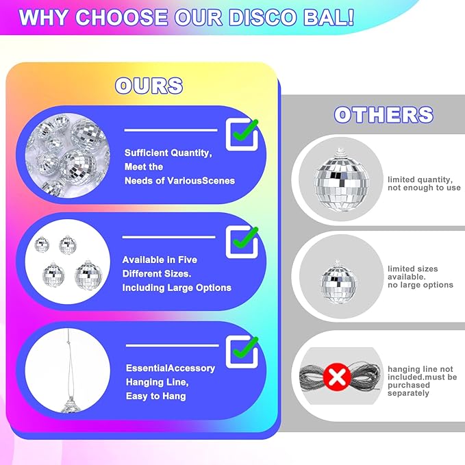 - Wide Application: Hanging disco party decorations have a simple, elegant, and stylish appearance. You can hang them wherever you want, such as in a banquet hall, living room, Christmas tree, or outdoor branches. Disco ball ornaments complement any style and add a touch of style