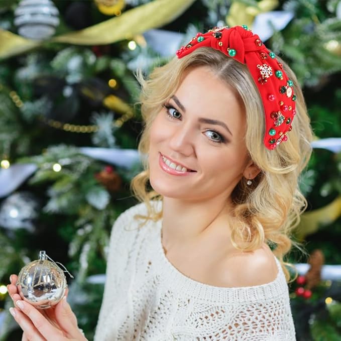 TODDER Red Christmas Knotted Headband, Santa Trees Embellished Pearl Rhinestone Headband for Women and Girls Christmas Hair Accessories Costumes and Gifts for Themed Parties and Holiday