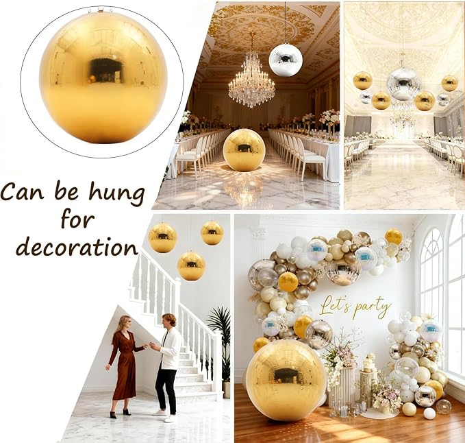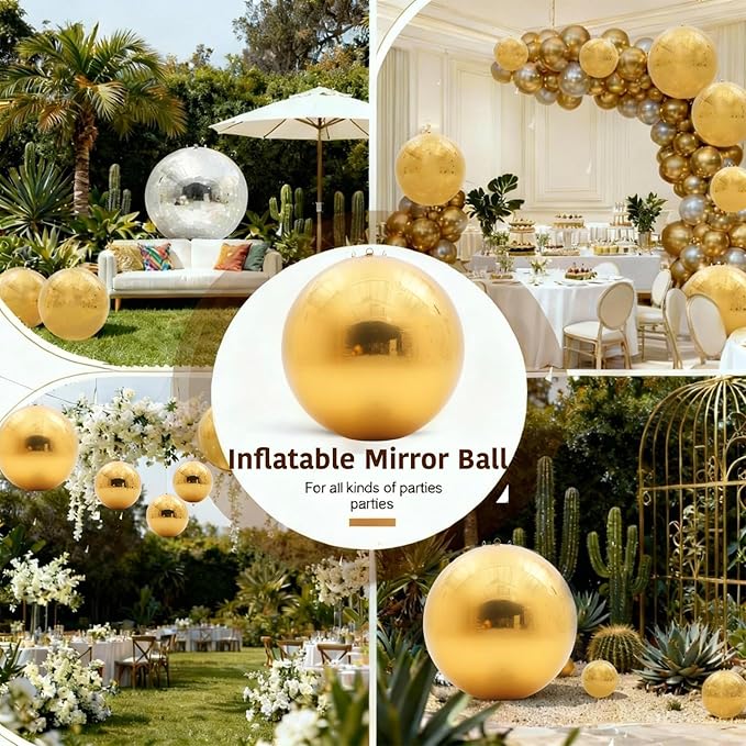 - Party PVC Mirror Balls Set: A set of 6pcs big shiny balls inflatable, 15.7inch*2, 19.7 inch*1, 31.5inch*1, 47.2inch*1, 59 inch*1. A 800W Electric pump is included in the package.