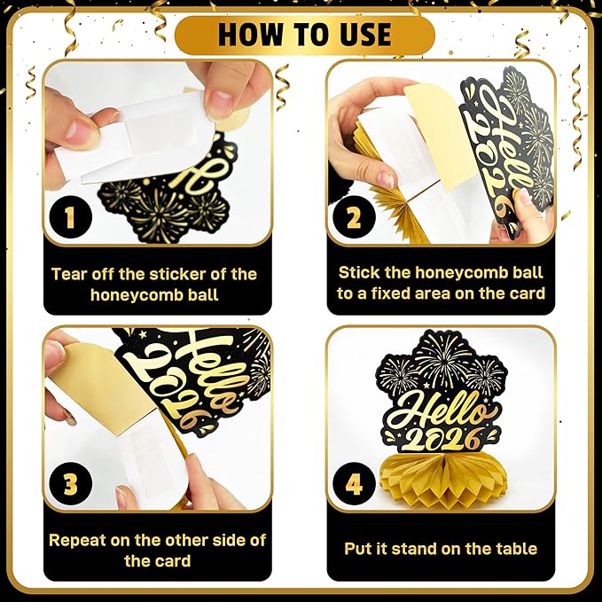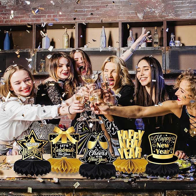 - ๐ HONEYCOMB DESIGNS: Elevate your New Year's Eve party with this stunning set of 9 different black and gold honeycomb centerpieces. Each piece features motivational quotes, clocks, top hats, balloons, and "2026" designs โ perfect for creating a festive and Instagram-worthy table setup.