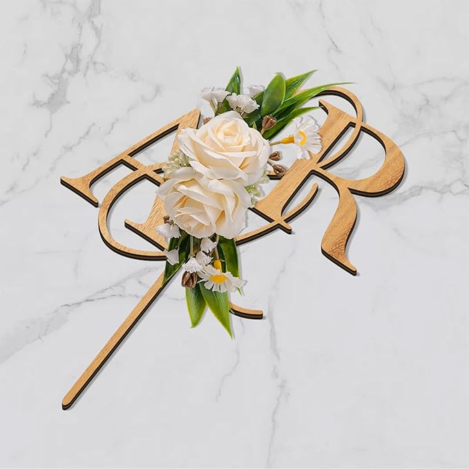 Wedding Cake Topper with 3D Artificial Flowers and Green Leaves Custom Initials Personalized Wooden Anniversary Cake Decoration (Oak Finish)